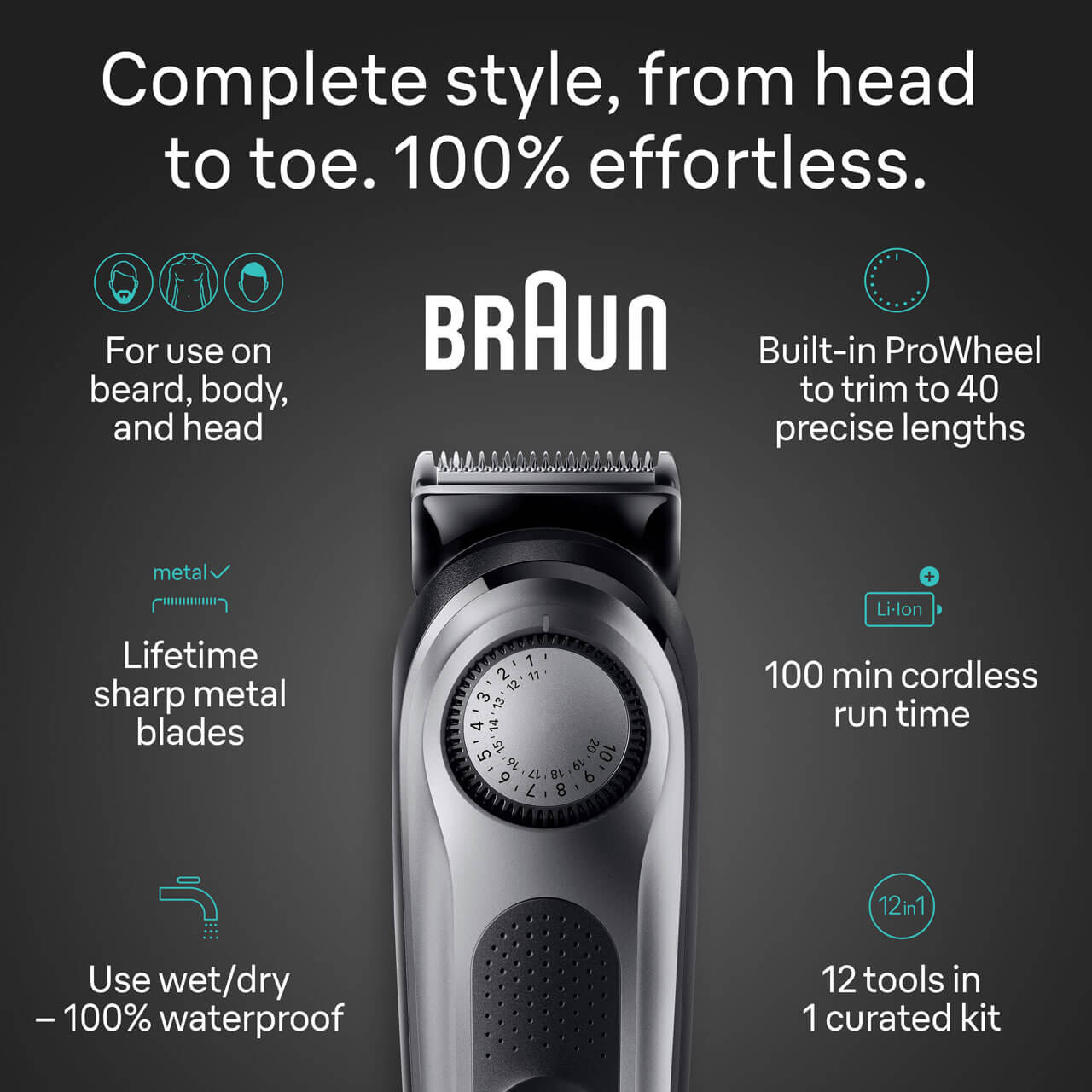 Braun Series 7 All-In-One Style Kit. For versatility and precision at home. With a beard, ear & nose trimmer, hair clippers and body groomer. Features the Precision Wheel with 40 length settings and our sharpest ProBlade. 100-minute cordless runtime.