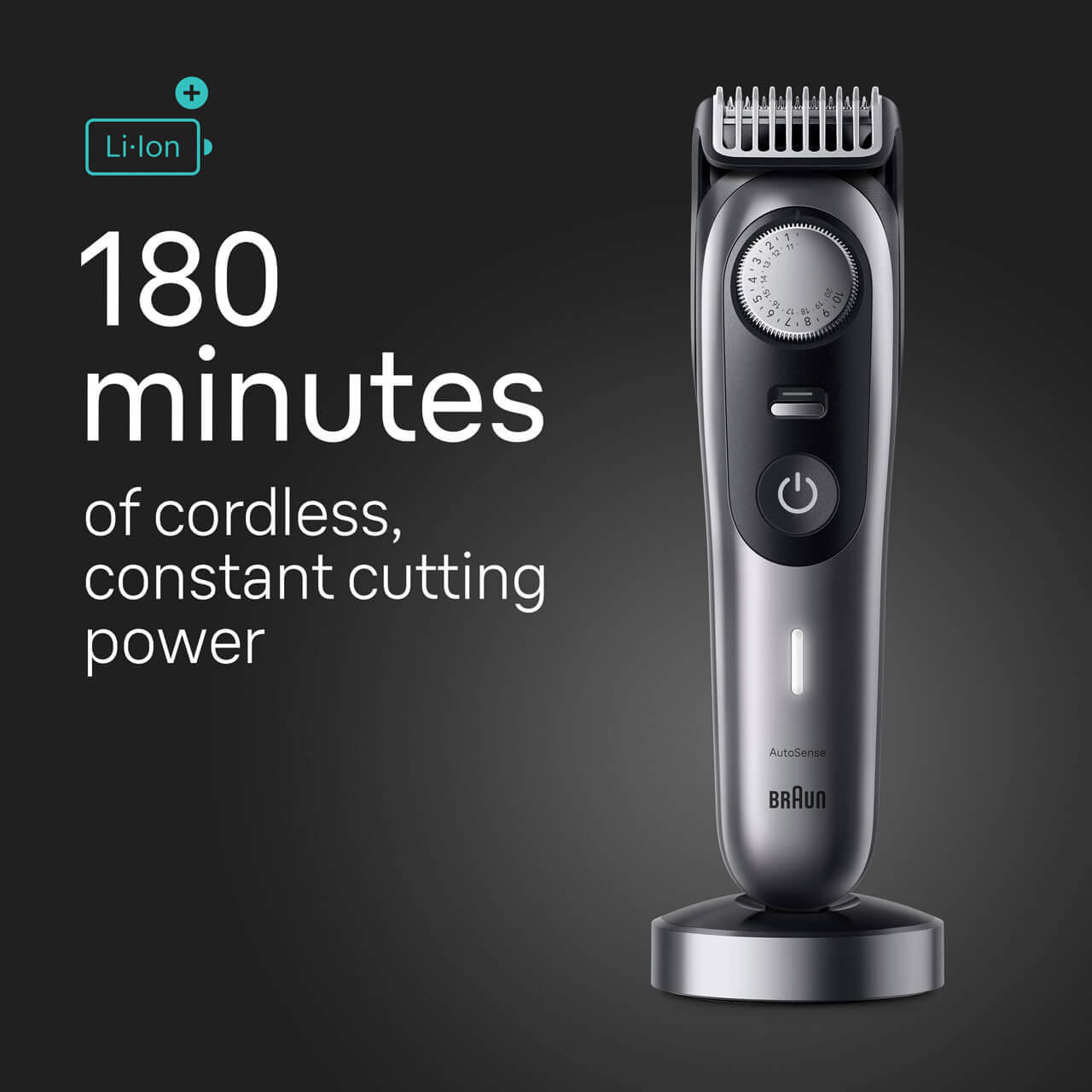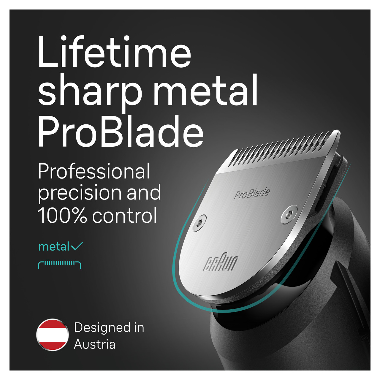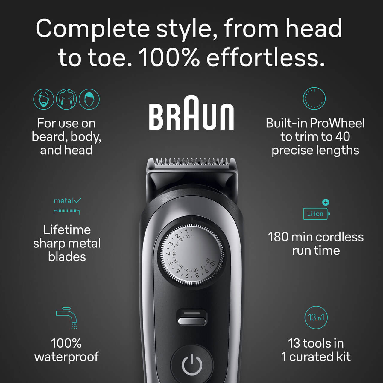 Braun Series 9 All-In-One Style Kit. For versatility and precision at home. With a beard, ear & nose trimmer, hair clippers and body groomer. Features the Precision Wheel with 40 length settings and our sharpest ProBlade.180-minute cordless runtime.