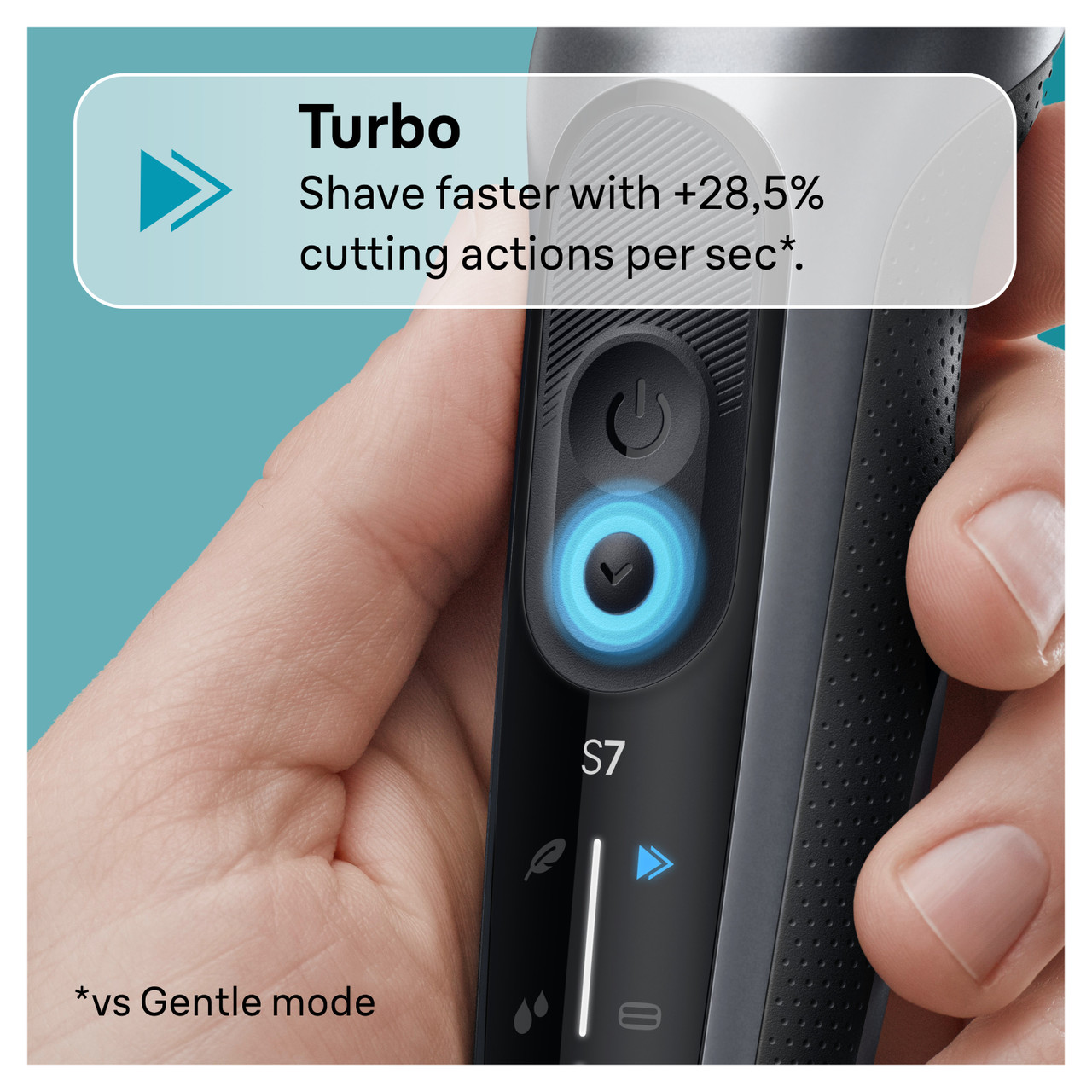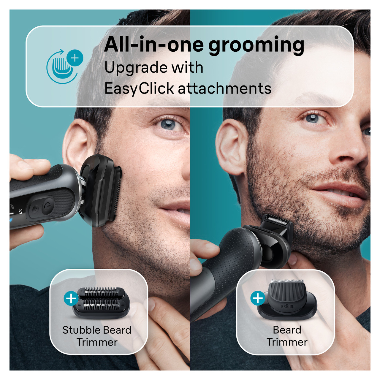 Braun Series 7 7185cc electric shaver for men delivers a close shave faster, thanks to the floating 360° Flex Head that adapts to your contours for an extremely close shave, even in tricky areas. To easily customize your shave, select Turbo mode for an extra fast shave, Gentle mode for a gentle shave on sensitive skin, or Standard mode for a balanced shave. Easily upgrade your shaver with different attachments for all your grooming needs. Includes a SmartCare center for a shaver like new, every day. Made to adapt to your shaving needs, this waterproof electric shaver features AutoSense technology that adjusts power to your beard density. The men’s shaver is made in Germany for guaranteed quality. Box includes: 1x Series 7 shaver, SmartCare Center, Cleaning Brush, Stubbler and Beard Trimmer with attachments.