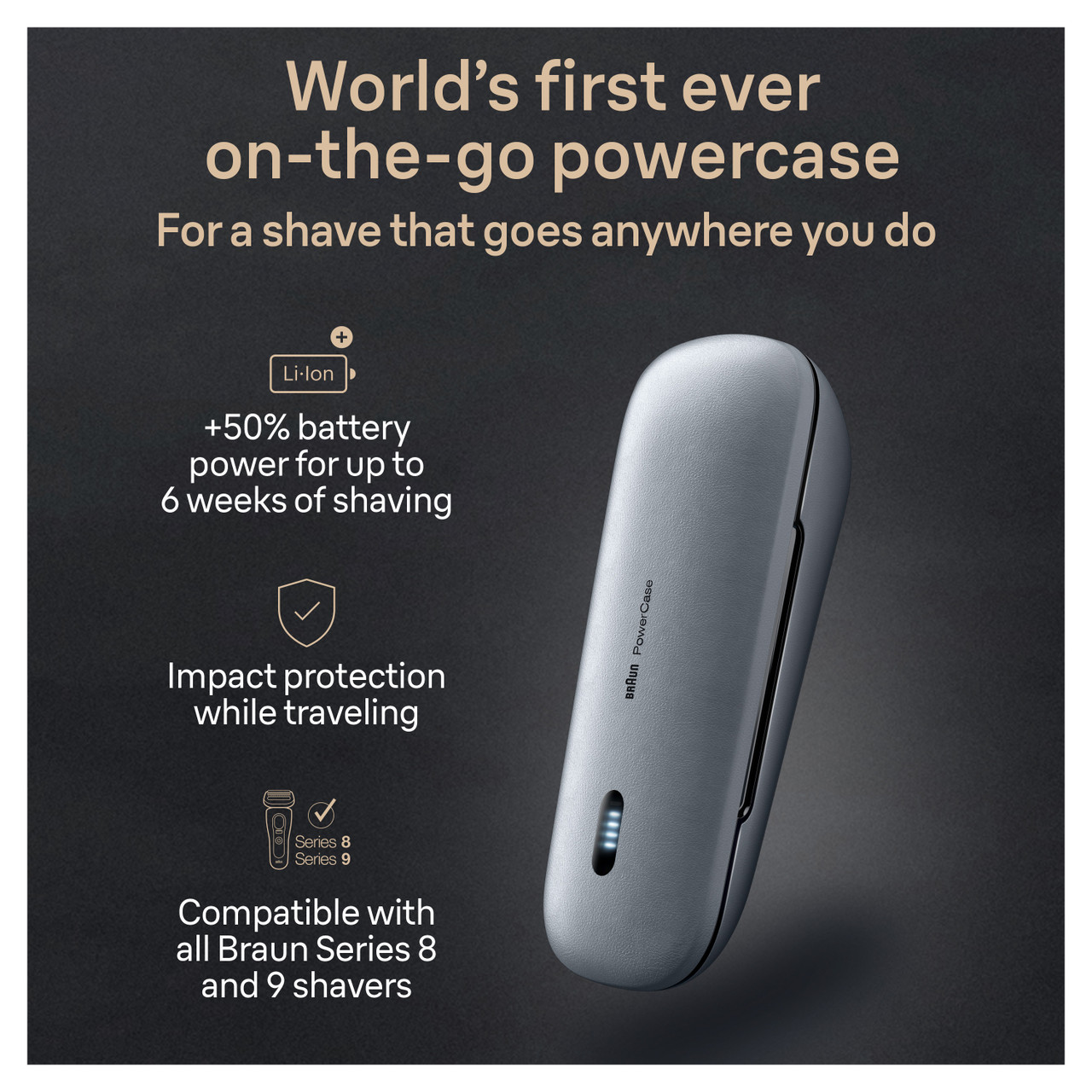Meet Braun PowerCase: the world's first fully portable shaver charger case. The case provides 50% more battery runtime—that's up to 6 weeks of cordless shaving anytime, anywhere. The PowerCase is built from durable premium materials, and is designed to protect your shaver from bumps, scratches, dust, and spillage. Fully compatible with Braun Series 9 Pro, Series 9 and Series 8 electric shavers for men. Get the world's first ever on-the-go powercase for a shave that goes anywhere you do. Designed for impact protection while traveling.